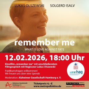 Lukas Olszewski erzählt in «remember me»; ein 40-minütiger Spielfilm, eindringlich die Geschichte seiner jungen Familie, die mit den Frühsymptomen einer Frontotemporaler Demenz (FTD) kämpft. Der Film berührt zutiefst und macht betroffen. Er vermittelt Einblick in das Unfassbare, was betroffene Familien erleben.